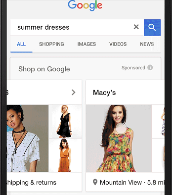 The ads are led by a main image which is most relevant to the user's search term, and is accompanied by two smaller images on the side. Beneath the image, you can either add a promotional message or the distance to the nearest store (available for advertisers using Local Inventory Ads). The ads are shown in a carousel format, allowing the user to scroll through the various products.