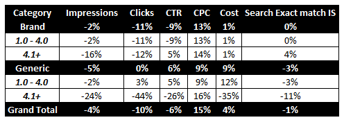 As a side note, we're also monitoring the impact of this on SEO - four weeks is not long enough to get any solid learnings for SEO, and that is compounded by the fact that Google is still heavily testing whether 3 or 4 ads appear, so data is very limited. However, we have taken keywords across our accounts and verticals that have more often than not had four ads appearing in the SERPs in the four weeks since the change and compared those with performance results before the change, which makes for very interesting reading.