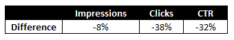 What we're seeing is a pretty significant drop in CTR across these keywords post-Google update. It's worth considering that seasonality is at play here - we would expect to see fluctuations in clicks and CTR month-on-month anyway - and the results are further impacted by the very limited data we have available. So although this isn't conclusive, the initial results indicate that CTR seems to be decreasing in line with the decrease paid ads are seeing when below position four, or to put it another way, 'below the fold'.