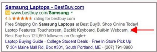 Created to beef up your real estate on your ad in the SERPs and supposedly give potential clickers yet another reason to click on your ad. In my opinon it looks too crowded and forces the user to spend longer deciding which part of the ad to read…so do I want to find out how many G+ followers the company has, how well the company is rated in reviews, where they're located, the telephone number, OR do I want to just find out if the company sells Samsung laptops and what special offer they have to make me click!?