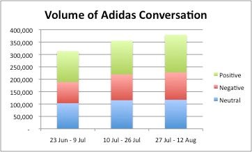 Furthermore, the relative proportion of positive discussion changed little. With Social Media playing such a huge part in this year's Olympics, you might have expected a bit more from Adidas and Cadbury. It begs the question: did Olympic sponsorship result in more positive buzz for the brands? Perhaps, but it also resulted in more negative buzz, too.