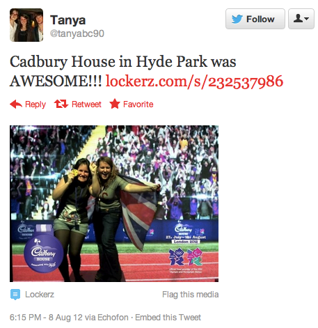 Cadbury had an early win with its Wispa Unwrap Gold campaign. But its big digital innovation came from its interactive Cadbury House, open in Hyde Park throughout the Olympics, allowing visitors to swipe a Radio Frequency Identification (RFID) Oyster-like card that instantly sent status updates and photos to Facebook and Twitter when swiped at touchpoints around the venue.