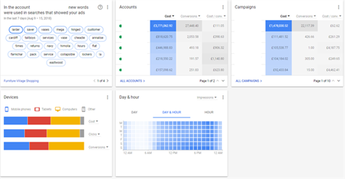 Right from the get go Google throws some useful (and aptly colourful) tools in your face. These visual representations give you instant insights into various useful metrics about your account. From well preforming keywords and device split performance to heatmaps of your day/hour performance over the past 7 days. These dashboards provide quick insights into trending performance to make preforming optimisations become a much more seamless process.