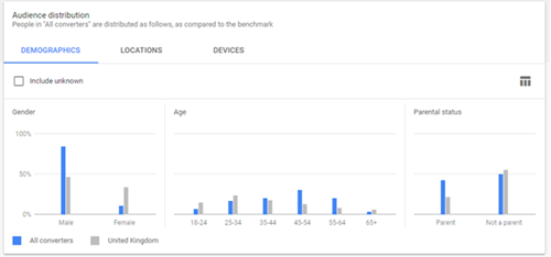 Perhaps my favourite part of the new interface is the Audience Insights page. I'm sure we're all glaringly aware of how important targeting the right audience is. Previously we had to preform manual analysis on these and create the graphs you see below ourselves. Well my friends the future really is now. Google now takes all the information in your account and provides you with broken down insights for gender, Age, Parental Status, Location and Device from any of your current audiences.