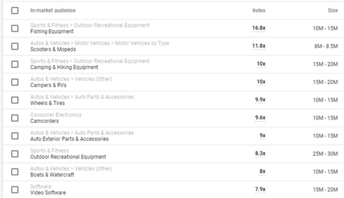 Then if they hadn't already treated you enough, below this they include potential In-Market 7 Affinity Audiences to add to your campaigns. What I find most interesting about this is that they include some audiences you may never even have heard thought of, but actually contain a large chunk of your converting user base, showing you how much more likely one the individuals within those audiences are likely to be contained in your list of converters.